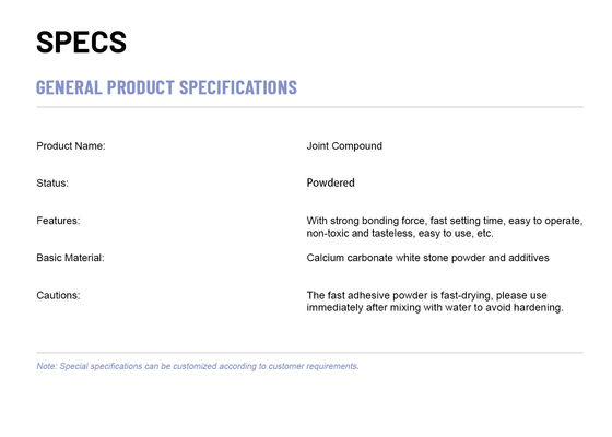 El compuesto de la junta del cartón yeso es un compuesto de enlace que se utiliza para unirse a los cartones yesos juntos. Puede ser utilizado en fondos bajos, medios y altos de la succión y es fácil mezclarse y aplicarse. Algunas de las características del compuesto de la junta del cartón yeso incluyen la hora laborable extendida, fácil mezclarse, permiso de tiempo mejorado para el ajuste, adherencia creciente con menos resbalamiento.